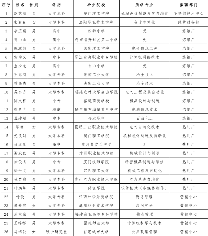 依據(jù)寶鋼德盛不銹鋼有限公司2023年招聘計(jì)劃,結(jié)合集團(tuán)公司《陽光招聘具體操作指引》工作要求,通過個(gè)人自愿報(bào)名、資格復(fù)審、面試考評等環(huán)節(jié),經(jīng)集團(tuán)公司審批通過,現(xiàn)將2023年社會(huì)招聘計(jì)劃第二批擬聘人員名單公示如下: