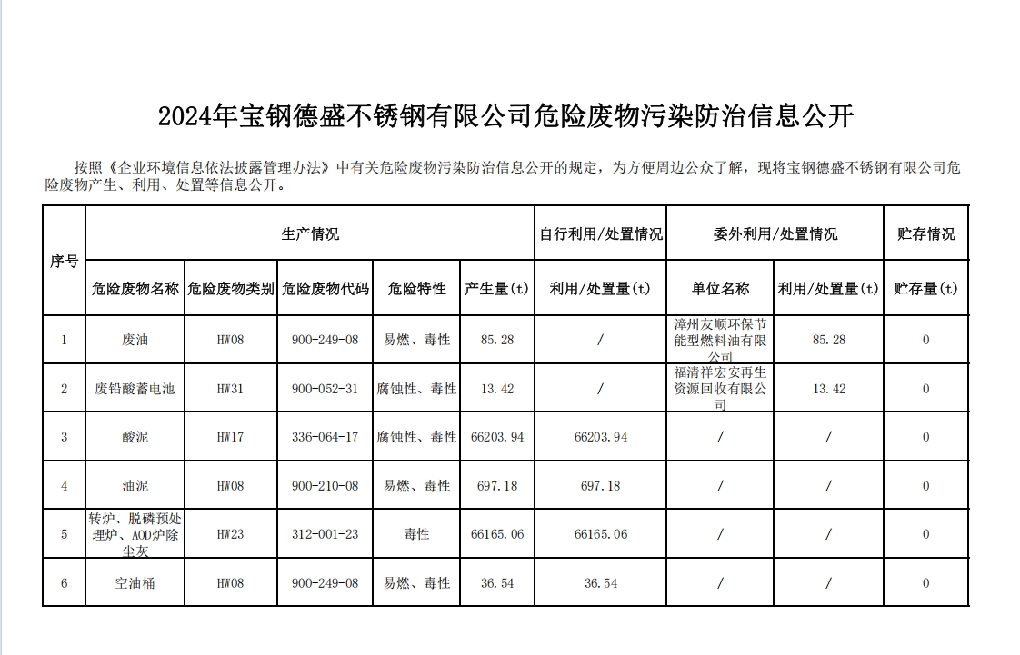 2024年寶鋼德盛不銹鋼有限公司危險(xiǎn)廢物污染防治信息公開